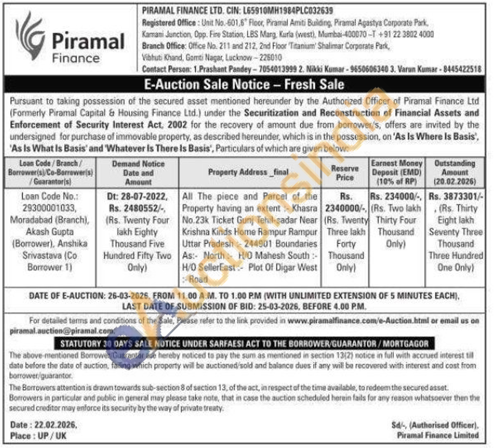 All The piece and Parcel of the Property having an extent: Khasra No.23k Ticket Gunj Tehil-sadar Near Krishna Kinds Home Rampur Rampur Uttar Pradesh:-244901 Boundaries As: North: H/O Mahesh South: H/O SellerEast: Plot Of Digar West :-Road