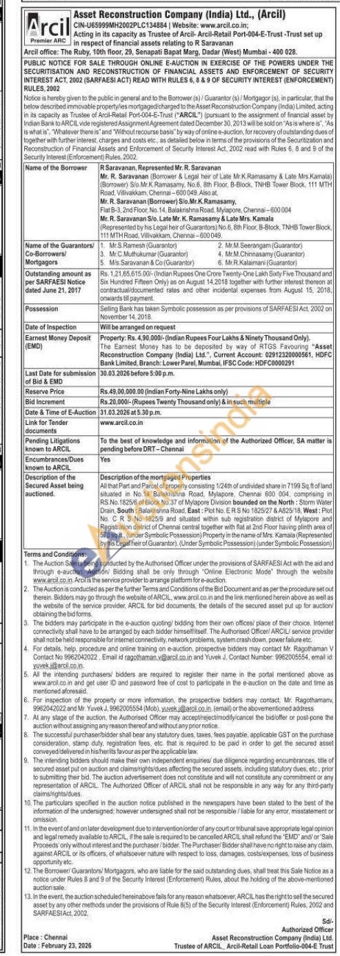 All that Part and Parcel of property consisting 1/24th of undivided share in 7199 5q.ft of land situated in No.14 Balakrishna Road, Mylapore. Chennai 600 004, comprising in RS. No. 1825/6 of Block No:37 of Mylapore Division bounded on the North: Storm Water Drain, South: Balakrishna Road, East: Plot No. ERS No 1825/27 & A825/18, West: Plot No. CRS No 1825/9 and situated within sub registration district of Mylapore and Registration district of Chennai central together with flat at 2nd Floor having plinth area of 570 sq ft., (under Symbolic Possession) Property in the name of Mrs. Kamala (Represented by his Legal heir of Guarantor), (Under Symbolic Possession) (under Symbolic Possession
