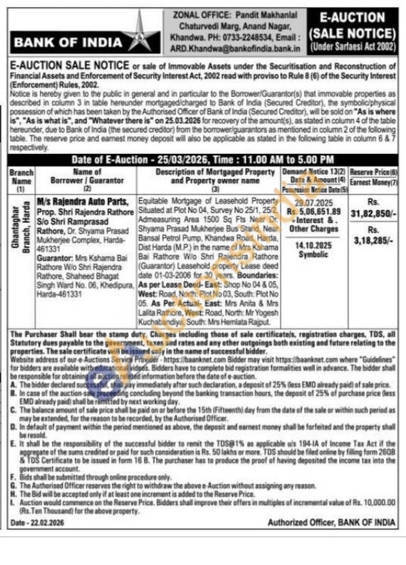 Equitable Mortgage of Leasehold Property Situated at Plot No 04, Survey No 25/1, 25/2. Admeasuring Area 1500 Sq Fts Near Dr. Shyama Prasad Mukherjee Bus Stand, Near Bansal Petrol Pump, Khandwa Road, Harda, Dist Harda (M.P.) in the name of Mrs Kshama Bai Rathore Wio Shri Rajendra Rathore (Guarantor) Leasehold property Lease deed date 01-03-2006 for 30 years. Boundaries: As per Lease Deed-East: Shop No 04 & 05, West: Road, North: Plot No 03, South: Plot No 05. As Per Actual- East: Mrs Anita & Mrs Lalita Rathore, West: Road, North: Mr Yogesh Kuchabandiya, South: Mrs Hemlata Rajput.