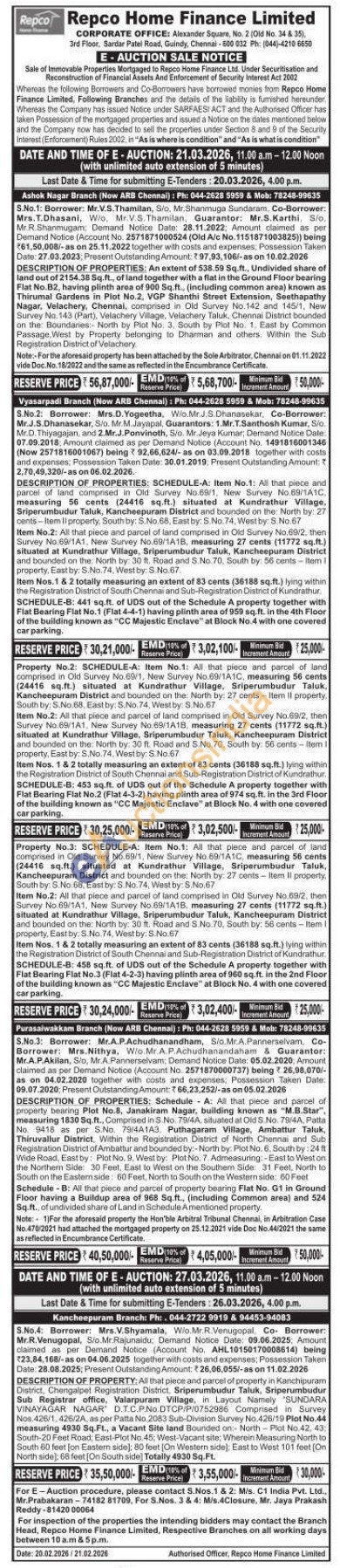 DESCRIPTION OF PROPERTIES: An extent of 538.59 Sq.ft., Undivided share of land out of 2154.38 Sq.ft., of land together with a flat in the Ground Floor bearing Flat No.82, having plinth area of 900 Sq.ft. (including common area) known as Thirumal Gardens in Plot No.2, VGP Shanthi Street Extension, Seethapathy Nagar, Velachery, Chennal, comprised in Old Survey No.142 and 145/1, New Survey No. 143 (Part), Velachery Village. Velachery Taluk, Chennai District bounded on the Boundaries: North by Plot No. 3. South by Plot No. 1. East by Common Passage, West by Property belonging to Dharman and others. Within the Sub Registration District of Velachery.