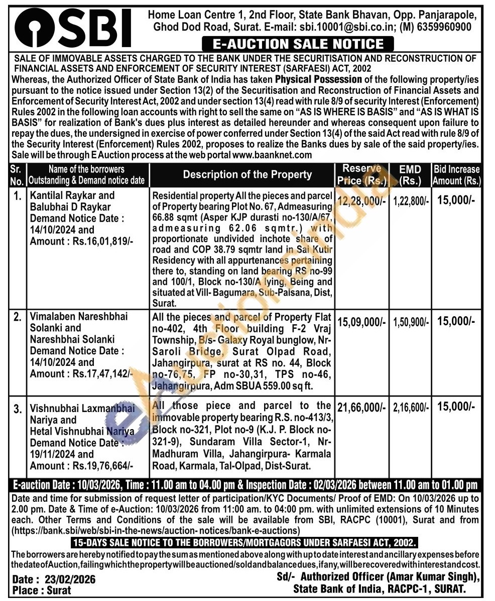 All the pieces and parcel of Property Flat no-402, 4th Floor building F-2 Vraj Township, B/s- Galaxy Royal bunglow, Nr-Saroli Bridge, Surat Olpad Road, Jahangirpura, surat at RS no. 44, Block no-76,75, FP no-30,31, TPS no-46, Jahangirpura, Adm SBUA 559.00 sq ft.