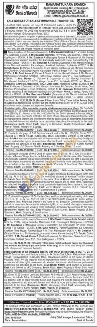 1)(3). Equitable Mortgage of 9.65 Cents of vacant land in Sy. No. 151/3 (Old Sy No: 582/1) situated at Feroke Village, Kozhikode Taluk, Kozhikode District in the name of Mr. Sivadasan Chemmanattil together with all improvements therein and including the right to access and all other rights, easements eto attached thereto and which is more particularly describing the schedule to the bank. Boundaries: North: Property of Kanchana, East: Balance Property, South: Cut Road, West: Cut Road.