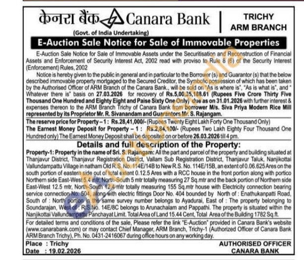 Property-1: Property in the name of Sri. S. Rajangam: All the part and parcel of the property and building situated at Thanjavur District, Thanjavur Registration District, Vallam Sub Registration District, Thanjavur Taluk, Nanjikottai Vallundampattu Village in natham Old R.S. No. 114E/14B to New R.S. No. 114E/158, an extent of 0.06.625 Ares on the south portion of eastem side out of total extent 0.12.5 Ares with a RCC house in the front portion along with portico Northen side East-West 5.4 mtr, North-South 5 mtr totally measuring 27 Sq.mtr and the back portion of Northem side East-West 12.5 mtr, North-South 12.4 mtr totally measuring 155 Sq.mtr house with Electricity connection bearing service connection No. 504, along with electric fittings Door No. 404 bounded by North of: Enathukanpatti Road, South of North portion in the same survey number belongs to Ayadurai, East of: The property belonging to Soundarajan, West of: R.S.No. 14E/8C belongs to Arunachalam and Pappathi. The property is situated within the Nanjikottai Vallundampattu Panchayat Limit. Total Area of Land 15.44 Cent, Total Area of the Building 1782 Sq. ft
