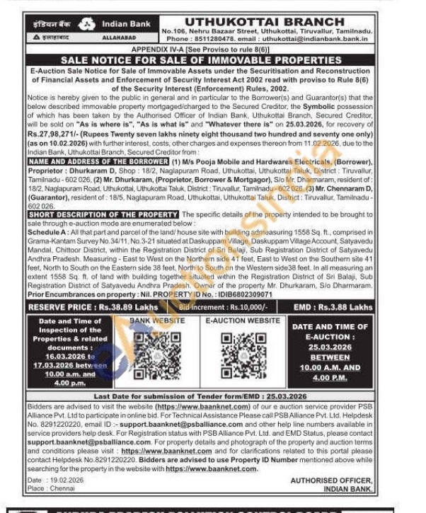 the specific details of the property intended to be brought to sale through e-auction mode are enumerated below: Schedule A: All that part and parcel of the land/ house site with building admeasuring 1555 Sq. ft. comprised in Grama-Kantam Survey No 34/11, No. 3-21 situated at Daskuppam Village, Daskuppam Village Account, Satyavedu Mandal, Chittoor District, within the Registration District of Sri Balaji, Sub Registration District of Satyavedu Andhra Pradesh. Measuring-East to West on the Northern side 41 feet, East to West on the Southern site 41 feet, North to South on the Eastern side 38 feet, North to South on the Western side38 feet. In all measuring an extent 1558 Sq. ft. of land with building together situated within the Registration District of Sri Balaji, Sub Registration District of Satyavedu Andhra Pradesh. Owner of the property Mr. Dhurkaram, Sio Dharmaram, Prior Encumbrances on property: Nil. PROPERTY ID No.: IDIB6802309071