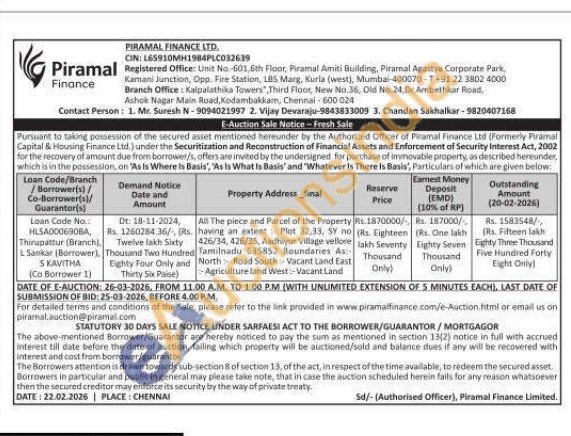 All The piece and Parcel of the Property having an extent Plot 32,33, SY no no 426/34, 426/35, Aadhiyur Village vellore Tamilnadu 635852 Boundaries As North Road South Vacant Land East Agriculture land West-Vacant Land