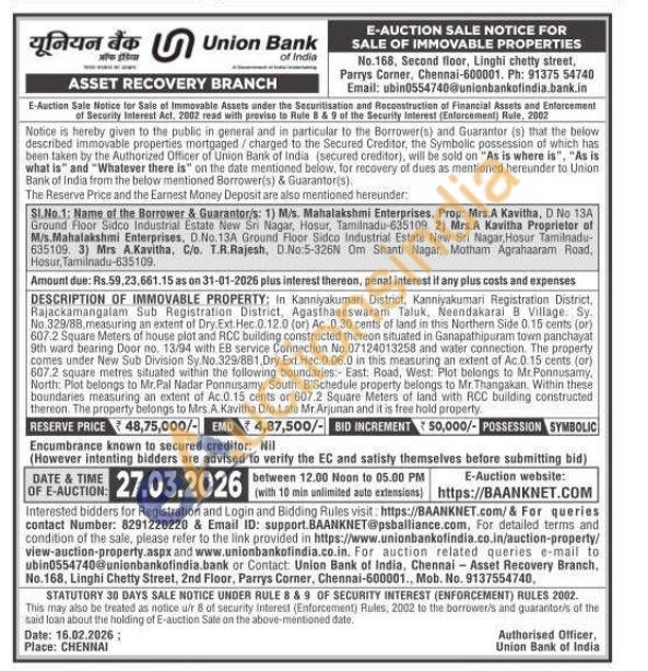 DESCRIPTION OF IMMOVABLE PROPERTY: In Kanniyakumari District, Kanniyakumari Registration District, Rajackamangalam Sub Registration District, Agasthaeeswaram Taluk, Neendakarai B Village. Sy. No.329/88,measuring an extent of Dry. Ext. Hec.0.12.0 (or) Ac.0.30 cents of land in this Northern Side 0.15 cents (pr) 607.2 Square Meters of house plot and RCC building constructed thereon situated in Ganapathipuram town panchayat 9th ward bearing Door no. 13/94 with EB service Connection No.07124013258 and water connection. The property comes under New Sub Division Sy.No.329/8B1,Dry.Ext.Hec.0.06.0 in this measuring an extent of Ac 0.15 cents (or) 607.2 square metres situated within the following boundaries: East: Road, West: Plot belongs to Mr.Ponnusamy, North: Plot belongs to Mr.Pal Nadar Ponnusamy, South: B'Schedule property belongs to Mr. Thangakan. Within these boundaries measuring an extent of Ac.0.15 cents or 607.2 Square Meters of land with RCC building constructed thereon. The property belongs to Mrs A. Kavitha Dio. Late Mr.Arjunan and it is free hold property.