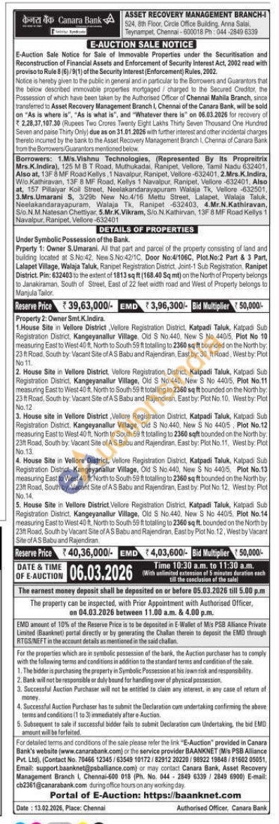 1.House Site in Vellore District, Veliore Registration District, Katpadi Taluk, Katpedi Sub Registration District Kangeyanallur V Village. Old S No.440. New S No 440/5, Plot No 10 measuring East to West 40ft, North to South 59 ft totalling to 2360 sq ft bounded on the North by 23 ft Road. South by: Vacant Site of AS Babu and Rajendran, East by: 30 ft Road, West by Plot 2. House Site in Vellore District. Vefore Registration District, Katpadi Taluk, Katpadi Sub Registration District, Kangeyanallur Village, Old S No.440, New S No 44015. Plot No.11 measuring East to West 40 ft. North to Soulh 59 ft totalling to 2360 sq ft bounded on the North by 23 It Road, South by Vacant Site of AS Babu and Rajendran, Eastby: Plot No. 10. West by Plat No.12 3. House site in Vellore District, Vellore Registration District, Katpadi Taluk, Katpad Su Registration District, Kangeyanallur Village, Old 5 No.440 New 8 No 440/5 Plot No.12 measuring East to West 40 ft. North to South 59 It totalling to 2360 sqft bounded on the North by 23ft Road, South by Vacant Site of AS Babu and Rajendran, East by: Plot No 11. West by: Plot No.13. 4. House Site in Vellore District, Velore Registration District, Katpadi Taluk, Kalpad Sub Registration District, Kangeyanallur Village, Old S No 440, New S No 4405. Plot No.13 measuring Esst to West 40 ft. North to South 59 ft totaling to 2360 sq ft bounded on the North by 23tt Road, South by, Vacant Site of AS Babu and Rajendran, East by. Plot No 12. Westby Plot No.14. 5. House Site in Vellors District. Vellore Registration District, Katpadi Taluk, Katpad Sut Registration District, Kangeyanallur Village, Old S No 440, New S No 4405 Plot No.14 measuring East to Wiest 45 ft. North to South 59 ft totalling to 2360 sq ft. bounded on the North by 23ft Road, Soulh by Vacant Site of AS Babu and Rajendran, East by Plot No. 12, West by Vacant Site of AS Babu and Rajendiran