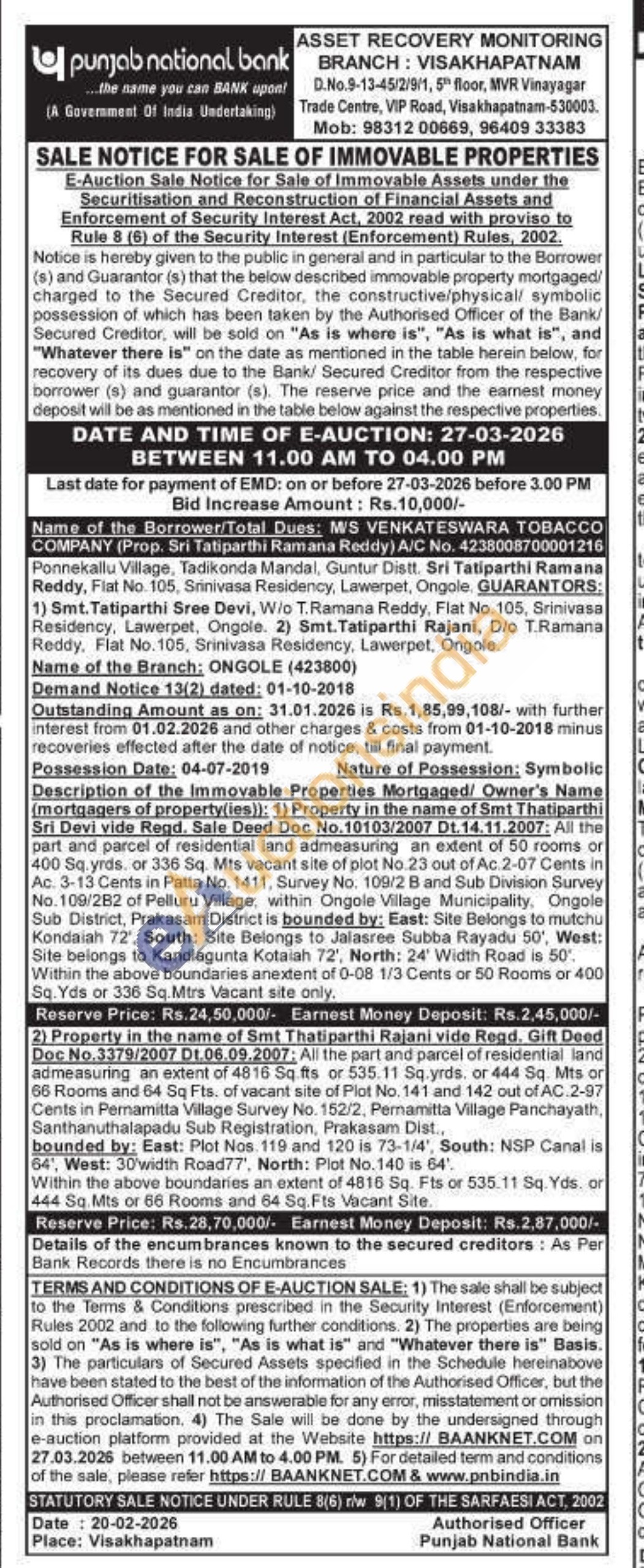 All the part and parcel of residential land admeasuring an extent of 4816 Sq fts or 535.11 Sq.yrds. or 444 Sq. Mts or 66 Rooms and 64 Sq Fts. of vacant site of Plot No. 141 and 142 out of AC 2-97 Cents in Permamitta Village Survey No. 152/2, Pernamitta Village Panchayath, Santhanuthalapadu Sub Registration, Prakasam Dist., bounded by: East: Plot Nos 119 and 120 is 73-1/4', South: NSP Canal is 64, West: 30width Road77', North: Plot No.140 is 64'. Within the above boundaries an extent of 4816 Sq. Fts or 535.11 Sq. Yds, or 444 Sq. Mts or 66 Rooms and 64 Sq. Fts Vacant Site.