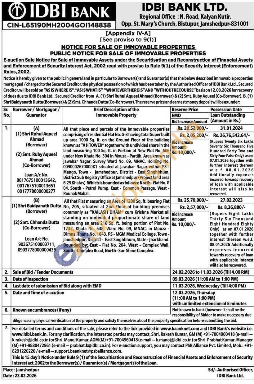 All that Flat measuring an Area of 1200 Sq. ft. bearing Flat No, 205, situated at 2nd Floor of building premises commonly as "KAILASH DHAM" cum Krishna Market all standing on undivided proportionate share of land measuring an area 210 Sq. ft. being portion of Plot No. 1732, Khata No. 538, Ward No. 09, MNAC, in Mouza Dimna, Thana No. 1643, PS-MGM Medical College, Town-Jamshedpur, District- East Singhbhum, State-Jharkhand. Bounded by: East Flat No. 204, West Complex Wall, South-Complex Road, North-Sun Shine Complex.