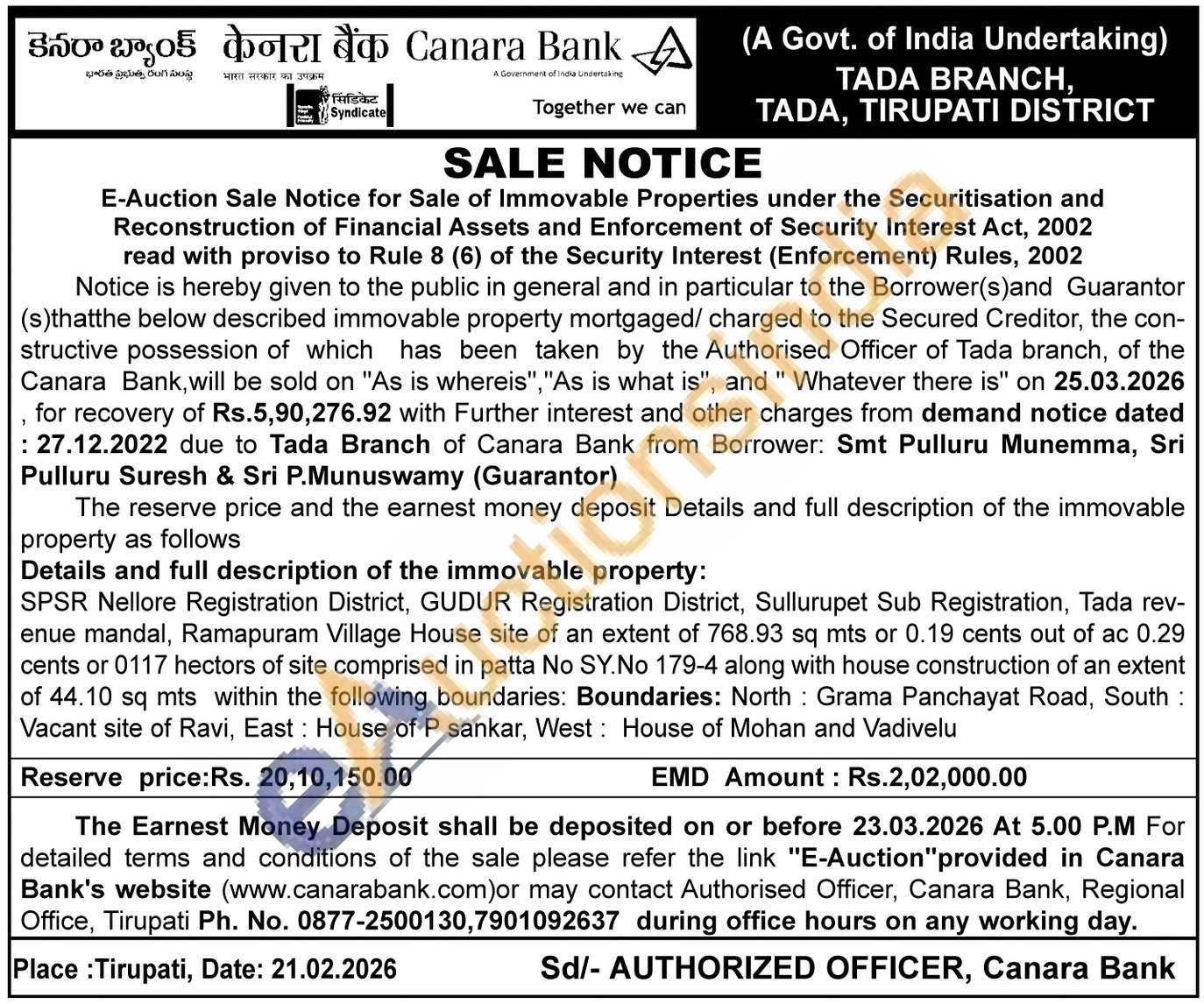 SPSR Nellore Registration District, GUDUR Registration District, Sullurupet Sub Registration, Tada rev-enue mandal, Ramapuram Village House site of an extent of 768.93 sq mts or 0.19 cents out of ac 0.29 cents or 0117 hectors of site comprised in patta No SY.No 179-4 along with house construction of an extent of 44.10 sq mts within the following boundaries: Boundaries: North: Grama Panchayat Road, South: Vacant site of Ravi, East: House of P sankar, West: House of Mohan and Vadivelu