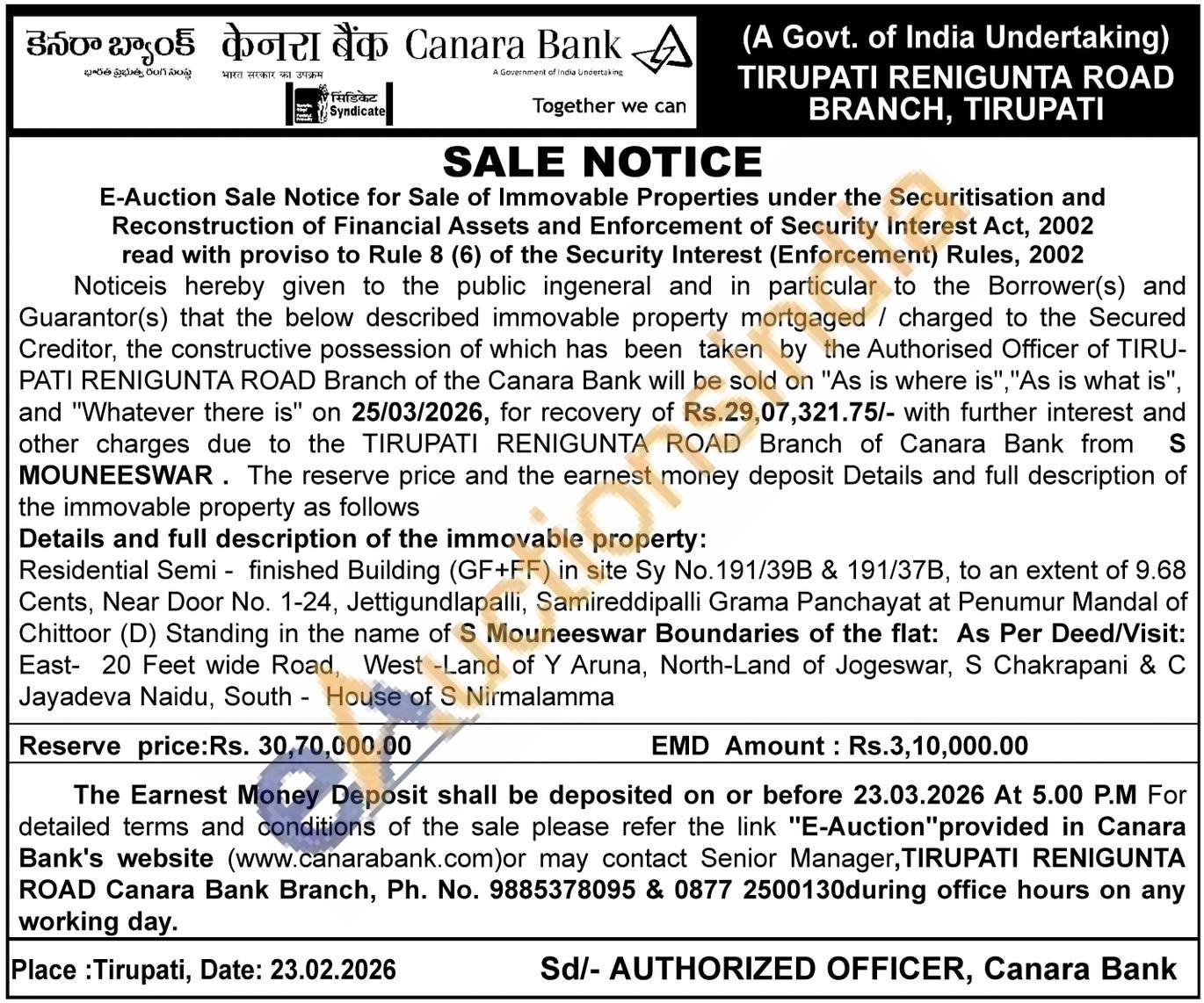 Residential Semi finished Building (GF+FF) in site Sy No. 191/39B & 191/37B, to an extent of 9.68 Cents, Near Door No. 1-24, Jettigundlapalli, Samireddipalli Grama Panchayat at Penumur Mandal of Chittoor (D) Standing in the name of S Mouneeswar Boundaries of the flat: As Per Deed/Visit: East- 20 Feet wide Road, West -Land of Y Aruna, North-Land of Jogeswar, S Chakrapani & C Jayadeva Naidu, South House of S Nirmalamma
