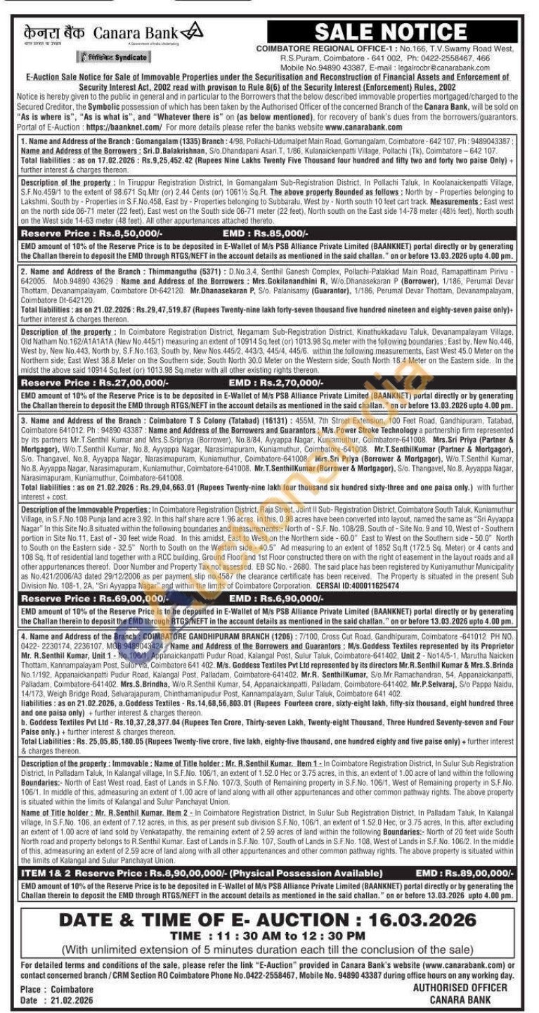 Description of the property: In Tiruppur Registration District, In Gomangalam Sub-Registration District. In Pollachi Taluk, In Koolanaickenpatti Village. S.F.No.458/1 to the extent of 98 671 Sq.Mtr (ar) 2.44 Cents (or) 1061% Sq. Ft. The above property Bounded as follows: North by Properties belonging to Lakshmi, South by Properties in SF.No. 458, East by Properties belonging to Subbaralu, West by North south 10 fest cart back. Measurements: East west on the north side 06-71 meter (22 fent). East west on the South side 06-71 meter (22 feet), North south on the East side 14-78 meter (48% feet), North south on the West side 14-63 meter (48 feet). All other appurtenances attached thereto