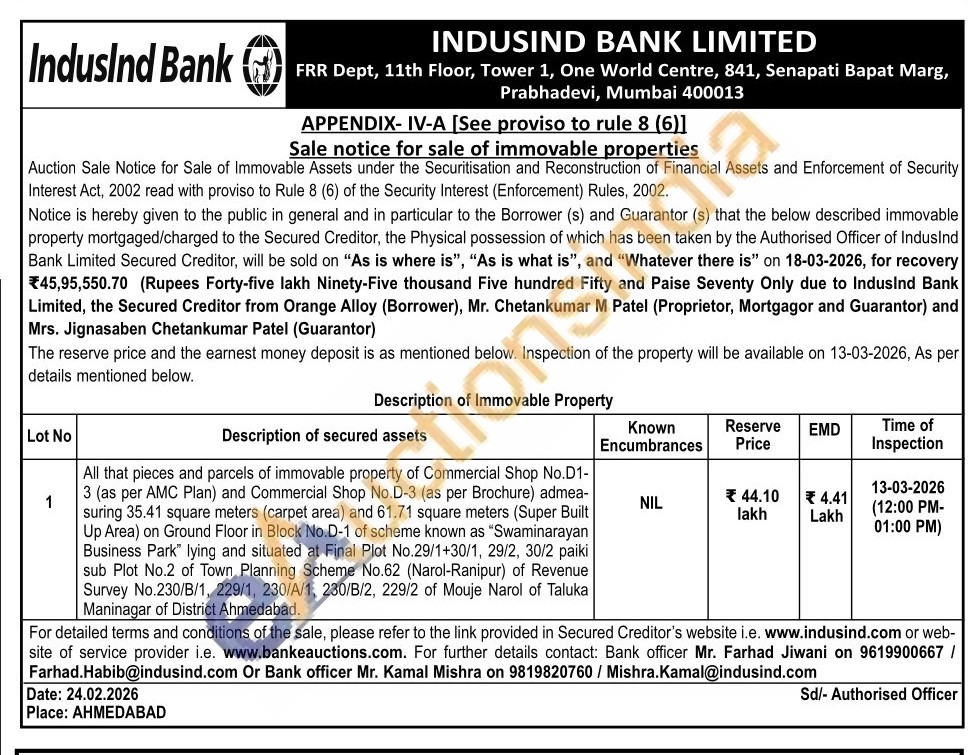 All that pieces and parcels of immovable property of Commercial Shop No.D1-3 (as per AMC Plan) and Commercial Shop No.D-3 (as per Brochure) admea-suring 35.41 square meters (carpet area) and 61.71 square meters (Super Built Up Area) on Ground Floor in Block No.D-1 of scheme known as "Swaminarayan Business Park" lying and situated at Final Plot No.29/1+30/1, 29/2, 30/2 paiki sub Plot No.2 of Town Planning Scheme No.62 (Narol-Ranipur) of Revenue Survey No.230/B/1, 229/1, 230/A/1, 230/B/2, 229/2 of Mouje Narol of Taluka Maninagar of District Ahmedabad.