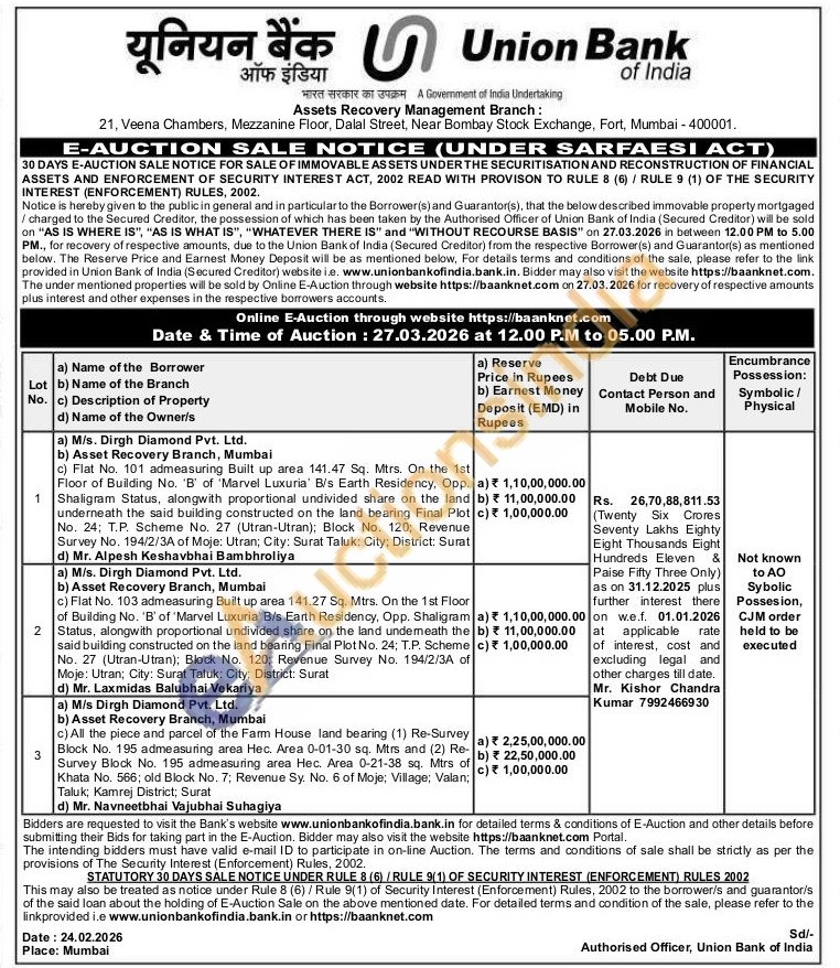 Flat No. 101 admeasuring Built up area 141.47 Sq. Mtrs. On the 1st Floor of Building No. 'B' of 'Marvel Luxuria' B/s Earth Residency, Opp. Shaligram Status, alongwith proportional undivided share on the land underneath the said building constructed on the land bearing Final Plot No. 24; T.P. Scheme No. 27 (Utran-Utran); Block No. 120; Revenue Survey No. 194/2/3A of Moje: Utran; City: Surat Taluk: City; District: Surat