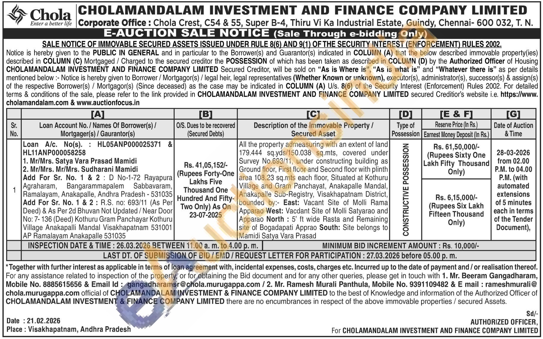 All the property admeasuring with an extent of land 179.444 sq.yds/150.038 sq.mts, covered under Survey No.693/11, under constructing building as Ground floor, First floor and Second floor with plinth area 108.23 sq.mts each floor, Situated at Kothuru Village and Gram Panchayat, Anakapalle Mandal, Anakapalle Sub-Registry, Visakhapatnam District, bounded by: East: Vacant Site of Molli Rama Apparao West: Vacdant Site of Molli Satyarao and Apparao North 5' ft wide Rasta and Remaining site of Bogadapati Apprao South: Site belongs to Mamidi Satya Vara Prasad