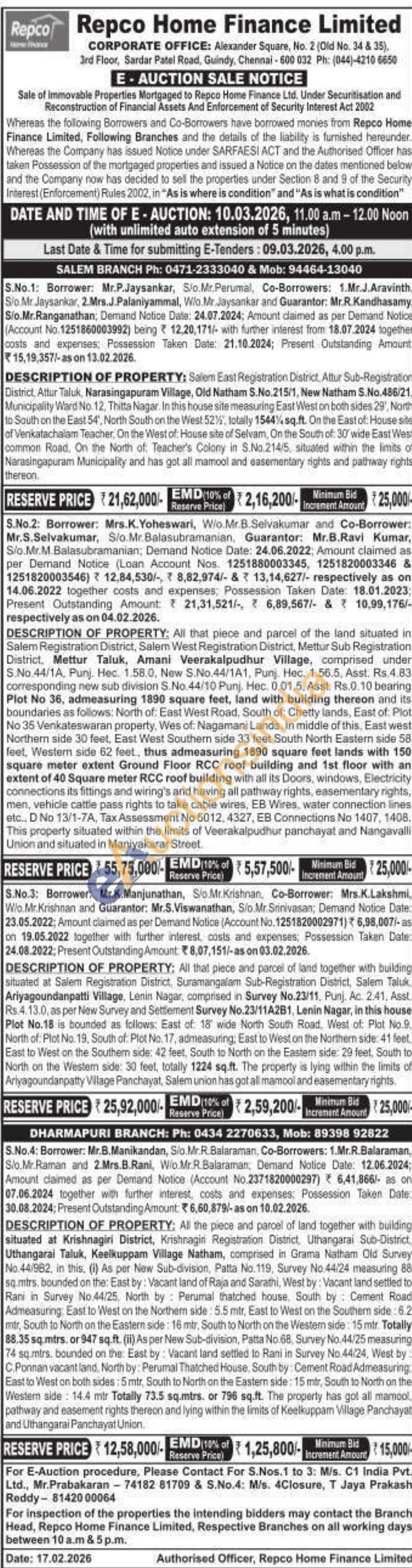 DESCRIPTION OF PROPERTY: All the piece and parcel of land together with building situated at Krishnagiri District, Krishnagiri Registration District, Uthangarai Sub-District Uthangarai Taluk, Keelkuppam Village Natham, comprised in Grama Natham Old Survey No.44/982, in this, (i) As per New Sub-division, Patta No.119, Survey No. 44/24 measuring 88 sq.mtrs, bounded on the: East by: Vacant land of Raja and Sarathi, West by: Vacant land settled to Rani in Survey No.44/25, North by Perumal thatched house, South by Cement Road Admeasuring: East to West on the Northern side: 5.5 mtr, East to West on the Southern side: 6.2 mtr, South to North on the Eastern side: 16 mtr, South to North on the Westem side: 15 mir. Totally 88.35 sq.mtrs. or 947 sq.ft. (ii) As per New Sub-division, Patta No. 68, Survey No.44/25 measuring 74 sq.mirs. bounded on the: East by: Vacant land settled to Rani in Survey No. 44/24, West by C. Ponnan vacant land, North by: Perumal Thatched House, South by: Cement Road Admeasuring East to West on both sides: 5 mtr, South to North on the Eastern side: 15 mitr, South to North on the Western side: 14.4 mtr Totally 73.5 sq.mtrs. or 796 sq.ft. The property has got all mamool pathway and easement rights thereon and lying within the limits of Keelkuppam Village Panchayat and Uthangarai Panchayat Union.