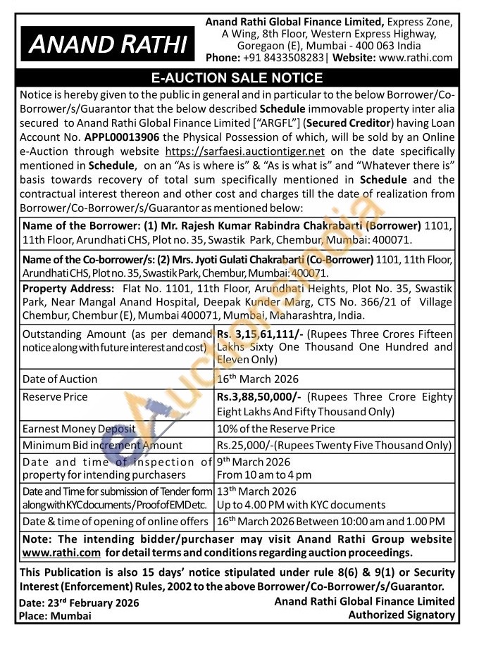 Property Address: Flat No. 1101, 11th Floor, Arundhati Heights, Plot No. 35, Swastik Park, Near Mangal Anand Hospital, Deepak Kunder Marg, CTS No. 366/21 of Village Chembur, Chembur (E), Mumbai 400071, Mumbai, Maharashtra, India.