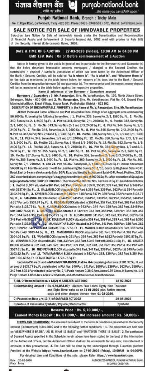 All that Piece and Parcel of House and Plot situated in Ennai Village of an aggregate area admeasuring 56,800 Sq. Ft. bearing the following Survey Nos. 1. Plot No. 339, Survey No. 2/1, 1580 Sq. Ft., 2. Plot No. 340, Survey No. 2/1,2400 Sq. Ft., 3. Plot No. 341. Survey No. 2/1,2400 Sq. Ft., 4. Plot No. 342, Survey No. 2/1,2400 Sq. Ft., 5. Plot No. 343, Survey Nos. 2/1 and 2/3, 2400 Sq. Ft. 6. Plot No. 344, Survey No. 2/3, 2400 Sq. Ft., 7. Plot No. 345, Survey No. 2/3, 2400 Sq. Ft., 8. Plot No. 346, Survey No. 2/3, 2400 Sq. Ft. 9. Plot No. 347, Survey Nos. 2/3 and 1/9,24005q. PL, 10. Plot No. 348, Survey Nos. 2/3, 1/9 and 3/1, 2400 Sq. Ft., 11. Plot No. 349, Survey Nos. 1/9 and 3/1, 2400Sq. Ft, 12. Plot No. 350, Survey Nos.2/3.1/8 and 3/1,2400 Sq. FL., 13. Plot No, 351, Survey Nos. 1/8 and 1/9, 2400 Sq. FL, 14. Plot No. 352, Survey No. 1/9, 2400 Sq. Ft. 15. Plot No. 353, Survey No. 1/9, 2400 Sq. Ft., 16. Plot No. 354, Survey Nos. 1/9 and 2/3, 2400 Sq. FL. 17. Plot No. 355, Survey No. 2/3, 2400 Sq. Ft, 18. Plot No. 356, Survey No. 2/3, 2400 Sq. Ft. 19. Plot No. 357, Survey No. 2/3, 2400 Sq. Ft., 20. Plot No. 358, Survey Nos. 2/1 and 2/3, 2400 Sq. Ft, 21. Plot No. 359. Survey No. 2/1,2400 Sq. Ft., 22. Plot No. 360, Survey No. 2/1,2400 Sq. Ft, 23. Plot No. 361. Survey No. 2/1, 2400 Sq. Ft. and 24. Plot No. 362. Survey Nos. 2/1 and 1/5, 2420 Sq. Ft. Overall Site Area is 56800 Sq. Ft. Four Boundaries: North by Land bearing the Survey No. 1/10, South by Raghavan Salai 40 Ft. Road, East by Swamy Vivekananda Salai 30 Ft. Road and West by Subbulaxmi Salai 40 Ft. Road. Plot Nos. 339 to 362 described above, comprising of an aggregate undivided area of 56700 Sq. Ft. (after deduction of Splay) are regrouped to form the PROPOSED BLOCKS. Their respective Old Plot Nos, and area in Sq. Ft. are indicated below 1. KABINI BLOCK situated in 364 Part, 347 Part. 354 Part & 355 Pt, 353 Pt, 339 Part, 362 Part & 348 Part with 3537.64 Sq. Ft., 2. KALLAR BLOCK situated in 355 Part & 356 Part, 339 Part, 362 Part & 354 Part with 3102.69 Sq. Ft., 3. KAVERI BLOCK situated in 345 Part, 346 Part & 347 Pt, 339 Part & 362 Part with 3102.77 Sq. FL, 4. KAMANDAL BLOCK situated in 344 Part, 345 Part, 356 Part, 339 Part, 362 Part, 355 Part, 346 Part &357 Part with 3537.64 Sq. Ft., 5. KEDILAM BLOCK situated in 356 Part, 357 Part, 339 Part, 362 Part &358 Part with 3102.79 Sq. Ft., 6. KUNDHA BLOCK situated in 343 Part, 344 Part, 339 Part, 362 Part, &345 Part with 3102.76 Sq. Ft. 7. MALATTAR BLOCK situated in 342 Part, 343 Part, 358 Part, 339 Part, 362 Part, 357 Part, 344 Part & 359 Part with 3537.79 Sq. Ft., 8. KUDAMURUTTI 341 Part, 342 Part., 339 Part, 362 Part & 343 Part with 3102.97 Sq. Fl., 9. KOLLIDAM BLOCK situated in 358 Part, 359 Part.339 Part, 362 Part & 360 Part with 3102.97 Sq. Ft, 10. MANIMUKTHA BLOCK situated in 340 Part, 341 Part, 360 Part, 339 Part, 362 Part. 359 Part, 342 Part & 361 Part with 3537.77 Sq. Ft., 11. MAYURA BLOCK situated in 339 Part, 362 Part & 340 Part with 3103.44 Sq. Ft, 12. MANIMUTHAR BLOCK situated in 361 Part, 339 Part & 362 Part with 3104.06 Sq. Ft, 13. VAIGAI BLOCK situated in 351 Part, 339 Part, 362 Part &352 Part with 3102.875q. Ft, 14. VENNARU BLOCK situated in 350 Part, 339Part, 362 Part & 349 Part with 3103.01 Sq. FL, 15. VASISTA BLOCK situated in 352 Part, 349 Part, 348 Part, 339 Part, 362 Part, 351 Part, 350 Part & 353 Part with 3537.61 Sq. Ft., 16. THENPENNAI BLOCK situated in 348 Part, 347 Part, 339 Part, 362 Part & 349 Part with 3103.12 Sq. Ft. and 17. THAMIRAPARANI BLOCK situated in 352 Part, 353, 339 Part, 362 Part & 354 Part with 3102.69 Sq. Ft. RETAINED AREA: 1775.76 Sq. Ft.