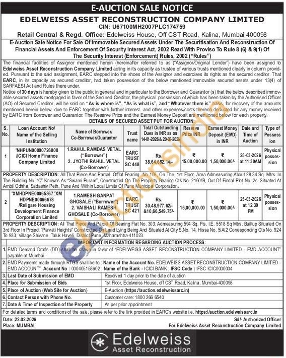 PROPERTY DESCRIPTION: All That Piece And Parcel Offlat Bearing No 108. On The 1st Floor Area Admeasuring About 28.34 Sq. Mtrs. In The Building No. "C" Knowns As "Swami Puram", Constructed On The Property Bearing Cts No. 2160/B, Out Of Findal Plot No. 2c. Situated At Ambi Odhha, Sadashiv Peth, Pune And Within Local Limits Of Pune Municipal Corporation