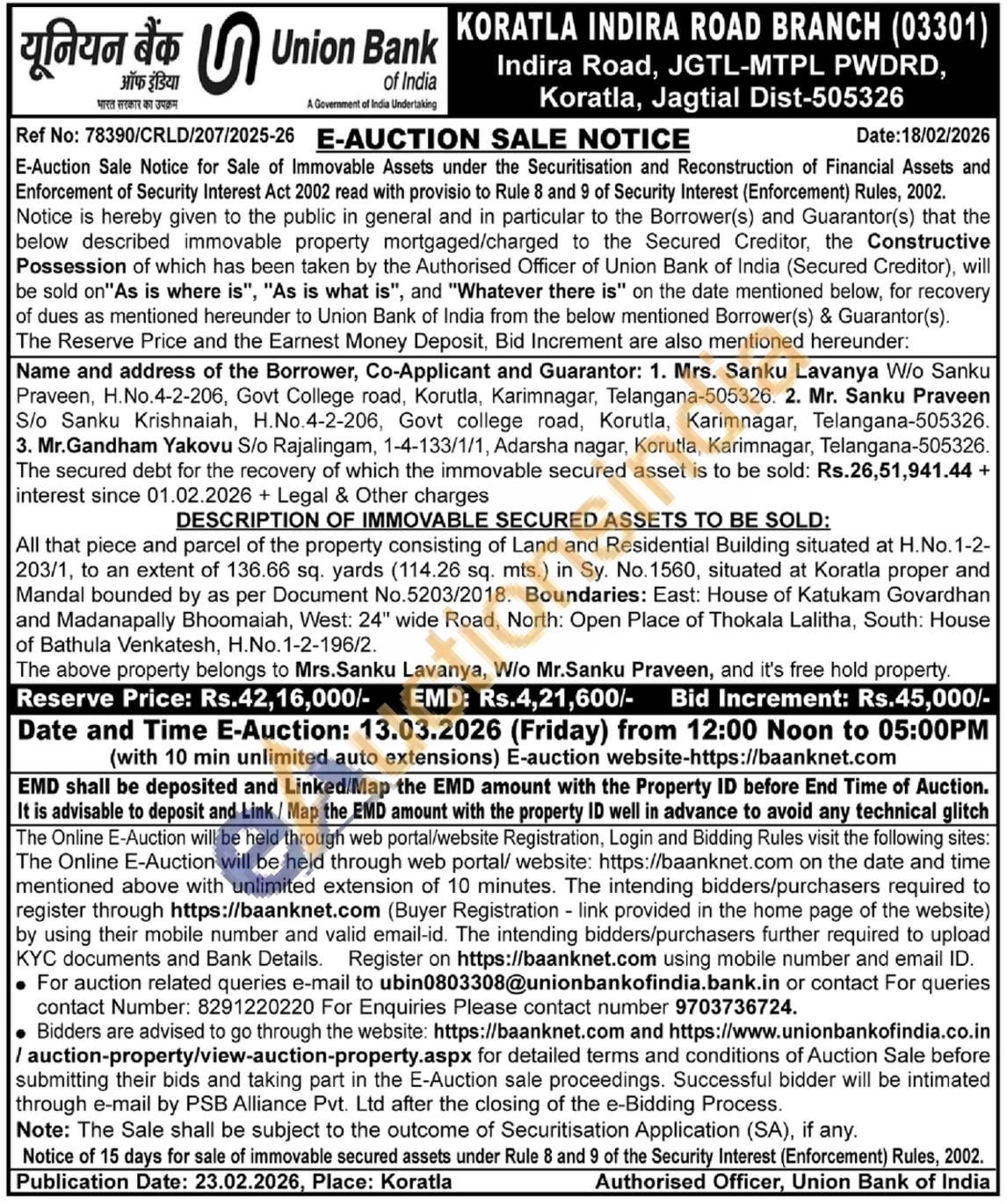 All that piece and parcel of the property consisting of Land and Residential Building situated at H.No.1-2-203/1, to an extent of 136.66 sq. yards (114.26 sq. mts.) in Sy. No. 1560, situated at Koratla proper and Mandal bounded by as per Document No.5203/2018. Boundaries: East: House of Katukam Govardhan and Madanapally Bhoomaiah, West: 24" wide Road, North: Open Place of Thokala Lalitha, South: House of Bathula Venkatesh, H.No.1-2-196/