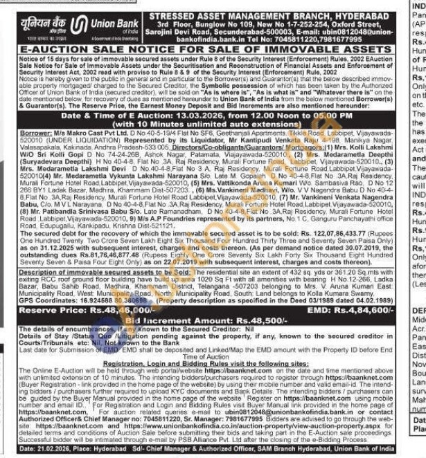 Description of immovable secured assets to be Sold: The residential site an extent of 432 aq, yds or 361.20 Sq.mts with exiting RCC roof ground floor building have build up area 1020 Sq Ft with all amenties with beanng H No. 12-266, Ladka Bazar, Babu Sahib Road, Madhira, Khammam District, Telangana -507203 belonging to Mrs. V. Aruna Kumari East. Municipality Road, West: Municipality Road, North: Municipality Road, South: Land belongs to Kolla Kumara Swamy
