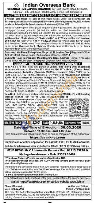 Item No.1: All that piece and parcel of vacant land along with dilapidated structure situated at Door No.253. Plot No.176, MTH Road, (Bazaar Road) Venkatapuram, Ambattur, Chennai- 600053 comprised in S.No- 594/1, as per Patta S. No. 594/1B2, TS No. 70 Block No-21. Ward No. B. measuring an extent of 12674 Sq.Ft situated at Ambattur Village and Taluk, Thiruvalluvar District within the Registration District of Chennai North and Registration Sub District of Ambaltur, and presently owned by Mr. M. Ibrahim Gani (Land extent 11917 sq ftas per Patta). Boundaries: East by-Venkatraman lyer Street & Building, West by-No. 250, Balaji Textiles and partly old MTH road, North by-Vijay DN Residential Apartments, South by-Old MTH Road and partly buildingItem No.2: All that piece and parcel of land measuring 2150 Sq. Ft, with building thereon bearing Plot No.176 Door No.253, Situated at MTH Road, Venkatpuram, Comprised in Grama Natham Old Survey No per patta New Survey No 594/18 Part Town Survey No.70, Block No.21. Ward No.B in Ambattur Village, Ambattur Taluk, Thiruvallur District. Boundaries: East by-Plot No.177, West by-Common Passage, North by-Common Passage, South by-Sold Portion, Within the Registration District of Chennai North and Sub Registration District of Ambattur.