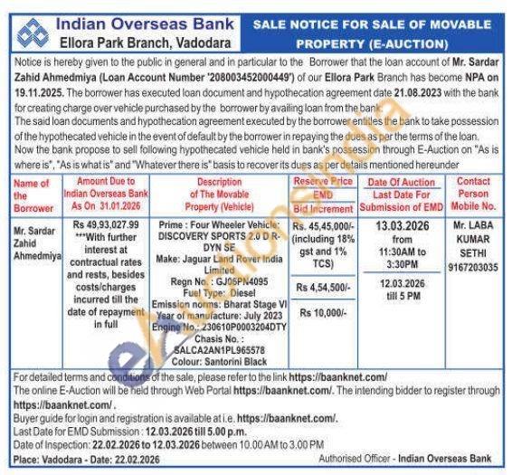 Prime: Four Wheeler Vehicle: DISCOVERY SPORTS 2.0 D R- DYN SE Make: Jaguar Land Rover India Limited Regn No.: GJ06PN4095 Fuel Type: Diesel Emission norms: Bharat Stage VI Year of manufacture: July 2023 Engine No.: 230610P0003204DTY Chasis No.: SALCA2AN1PL965578 Colour: Santorini Black