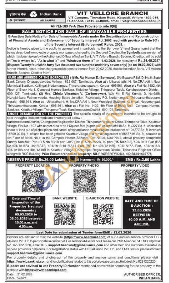 Kancheepuram District, Chengalpet Registration District, Thiruporur Registrar Office, Thiruporur Taluk, Kolathur Village, Flat No. 1402 with carpet area of 441 Square feet (super built up area of 640 Sq. ft.) 327 Sq. ft. undivided share of land out of all that piece and parcel of vacant lands measuring an total extent of 101277 Sq. ft. in which 15699.02 Sq. ft. of land has been gifted to Kolathur Village and remaining extent of 85577.98 Sq. ft., situated at 4th Floor of Block No.1, in the Compact Homes-Sankara, Old No.26, New No.2, above property comprised Survey Nos. 39/1 Part (RS No.39/18 part. 39/2 Part (RS No.39/28, 40 part (RS No.40/2), 401/1A11 Part (RS) No.401/1A118), 401/1412, 401/1A13,401/1A14 Part (RS No.401/1A14B), 401/1A1BA Part, 401/1A188, 401/1A19A and 401/1A198 in Kolathur Village, Chengalpet Registration District. Thiruporur Registrar Office along with RCC Building Prior Encumbrances on property: Nil. PROPERTY ID No.: IDIB6701492775