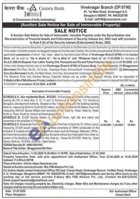 SCHEDULE A: Alur residential Block-B12/303: All that piece and Parcel of the property bearing No. 128, in block Nos. 9, 10, 11 and 12 formed out of Survey No. 113, formed by Bengaluru Development Authority, Situated at Alur Village, along with the building standing there on, measuring North to South 60.00 meters, and East to West 44.00 Meters, thus in all measuring 2640.00 Square Meters and bounded on the East by: Road, West by: Road, North by: Road, South by: Vecant land belonging to BDA SCHEDULE B: 33.526 Square Meters of undivided share, right title and interst and ownership in the schedule 'A' Property. SCHEDULE C: Residential Flat No. 812/303 on the Third floor in block No. 12, of Alur Layout. measuring 33.526 square meters of Built up area comprising of 1BHK constructed on the schedule 'A' property and proportionate common areas, such as Passage, Staircase, Lift Etc.. and have the exclusive right to use and enjoy the same without any interruption from other co-owners of the Building and bounded on the. East by House No. B12/302, West by: Open Space, North by 812/304, South by: Open Space
