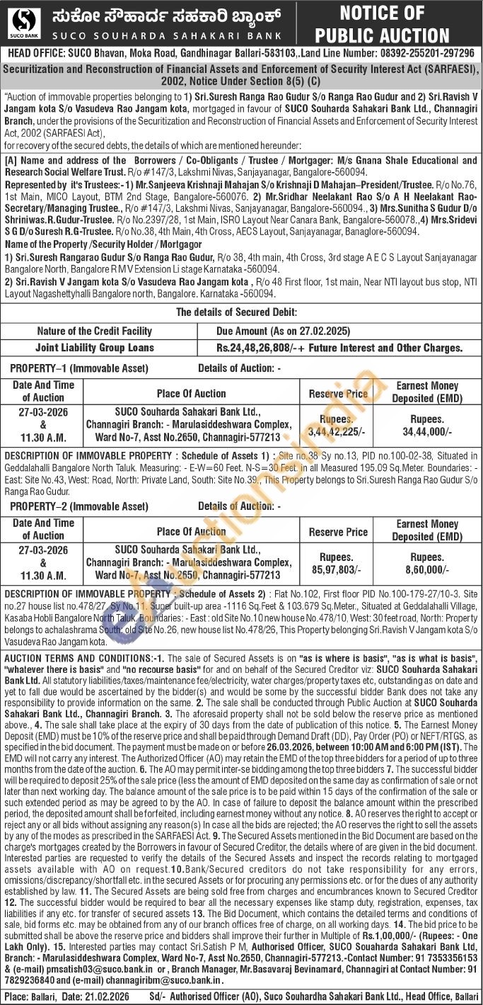 DESCRIPTION OF IMMOVABLE PROPERTY: Schedule of Assets 1): Site no. 38 Sy no.13. PID no.100-02-38, Situated in Geddalahalli Bangalore North Taluk. Measuring: -E-W-60 Feet. N-S-30 Feet in all Measured 195.09 Sq. Meter. Boundaries: -East: Site No. 43, West: Road, North: Private Land, South: Site No. 39. This Property belongs to Sri. Suresh Ranga Rao Gudur 5/0 Ranga Rao Gudur