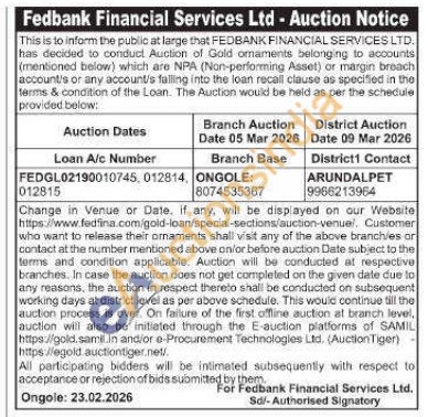 Fedbank Financial Services Ltd Gold Auctions Auction in Vijayawada