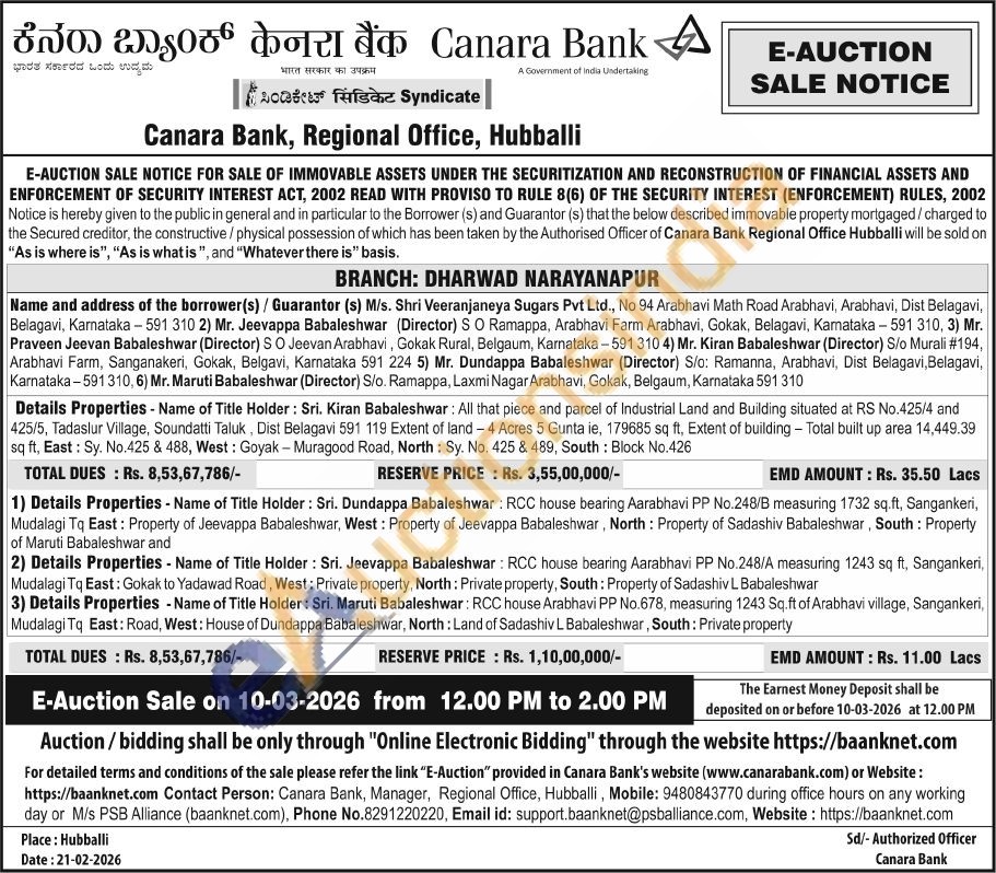 1) Details Properties - Name of Title Holder: Sri. Dundappa Babaleshwar: RCC house bearing Aarabhavi PP No.248/B measuring 1732 sq.ft, Sangankeri, Mudalagi Tq East: Property of Jeevappa Babaleshwar, West: Property of Jeevappa Babaleshwar, North: Property of Sadashiv Babaleshwar, South: Property of Maruti Babaleshwar and