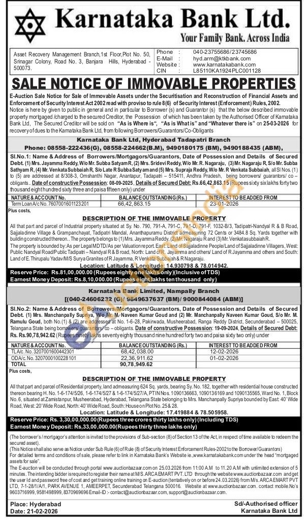 All that part and parcel of Industrial property situated at Sy. No. 790, 791-A, 791-C, 791-D, 791-F, 1032-8/3, Tadipatri-Nandyal R & B Road, Sajjala dinne Village & Grampanchayat, Tadipatri Mandal, Anantapur District admeasuring 72 Cents or 3484.8 Sq. Yards together with building constructed thereon. The property belongs to (1) Mrs. Jayamma Reddy, (2) Mr. Nagaraju Rand (3) Mr. Venkatasubbaiah R. The property is bounded by: As per Legal MDTD/As per Valuation report East: Land of Sajjaladinne People Land of Sajjaladinne Villagers, West: Public Nandyal Road/Public Tadipatri-Nandyal R & B road, North: Land of R. Jayamma and others/ Land of R Jayamma and others and South: Land of E. Thirupalu Yadav M/S Surya Granites of R Jayamma, R Venkata Subbaiah & R Nagaraju.