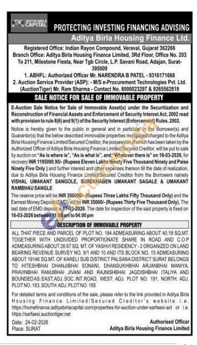 ALL THAT PIECE AND PARCEL OF PLOT NO. 184 ADMEASURING ABOUT 40,18 SQ.MT. TOGETHER WITH UNDIVIDED PROPORTIONATE SHARE IN ROAD AND CO.P ADMEASURING ABOUT 28.67 SQ. MT. OF YASHVI RESIDENCY-2 ORGANIZED ON LAND BEARING REVENUE SURVEY NO. 9/1 AND 10 AND ITS BLOCK NO. 15 ADMEASURING ABOUT 19146 SQMT. OF KARELI SUB DISTRICT PALSANA DISTRICT SURAT BELONGS TO HITESHBHAI DHANJIBHAI SONANI, DHANSUKHBHAI ARJANBHAI MANIYA, PRAVINBHAI RAMJIBHAI JIVANI AND RAJNISHBHAI JAGDISHBHAI ITALIYA AND BOUNDED AS: EAST ADJ. SOC. INT. ROAD, WEST: ADJ PLOT NO 191, NORTH: ADJ. PLOT NO: 183, SOUTH ADJ. PLOTNO 185