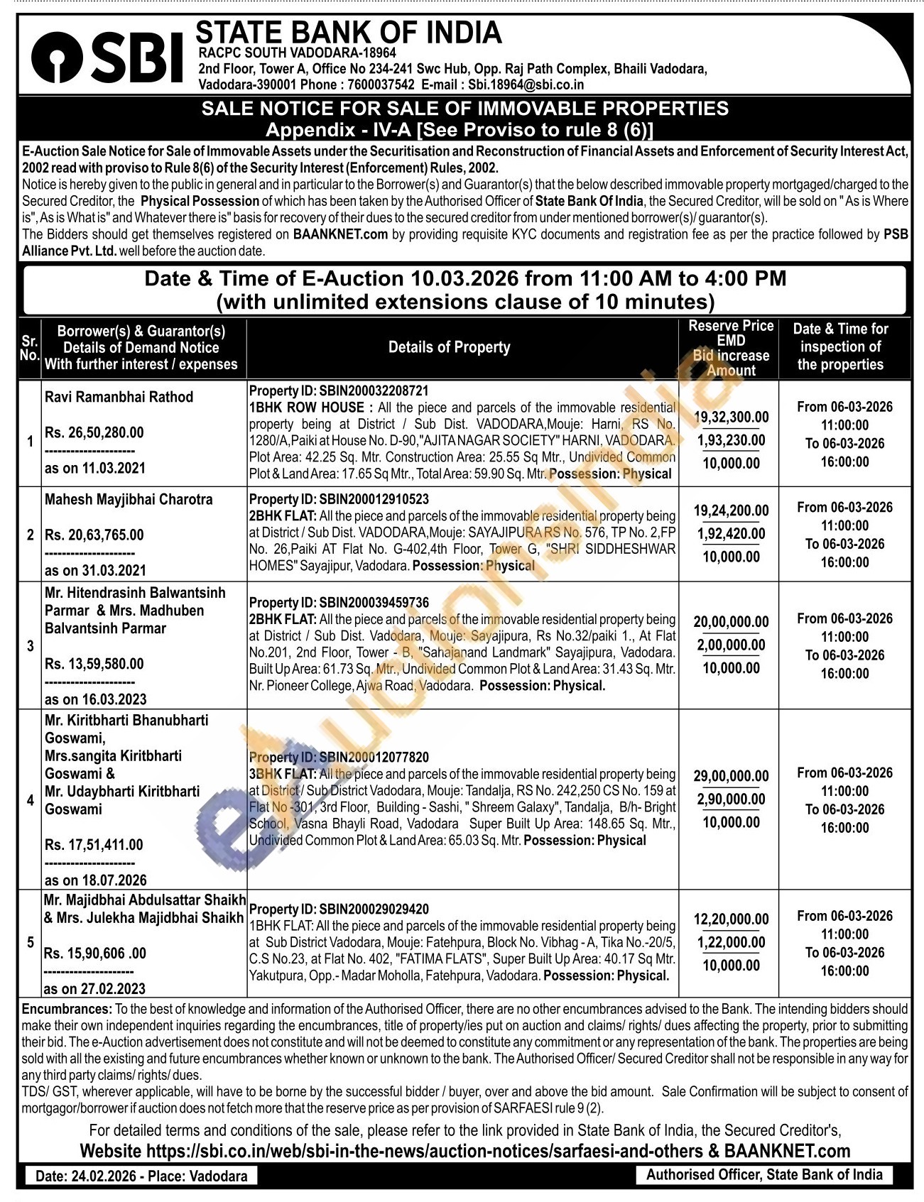 1BHK ROW HOUSE: All the piece and parcels of the immovable residential property being at District / Sub Dist. VADODARA, Mouje: Harni, RS No. 1280/A, Paiki at House No. D-90, "AJITANAGAR SOCIETY" HARNI, VADODARA. Plot Area: 42.25 Sq. Mtr. Construction Area: 25.55 Sq Mtr., Undivided Common Plot & Land Area: 17.65 Sq Mtr., Total Area: 59.90 Sq. Mtr. Possession: Physical