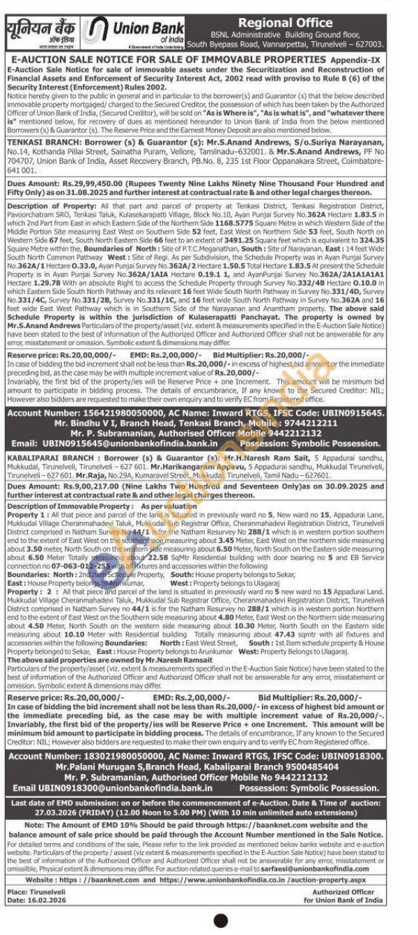 All that part and parcel of property at Tenkasi District, Tenkasi Registration District, Pavoorchatram SRO, Tenkasi Taluk, Kulasekarapatti Village, Block No.10, Ayan Punjal Survey No.362A Hectare 1.83.5 in which 2nd Part from East in which Eastern Side of the Northern Side 1168.5775 Square Metre in which Western Side of the Middle Portion Site measuring East West on Southern Side 52 feet, East West on Northern Side 53 feet, South North on Western Side 67 feet, South North Eastern Side 66 feet to an extent of 3491.25 Square feet which is equivalent to 324,35 Square Metre within the, Boundaries of North: Site of R.T.C.Meganathan, South: Site of Narayanan, East: 14 feet Wide South North Common Pathway West: Site of Regi. As per Subdivision, the Schedule Property was in Ayan Punjai Survey No.3624/1 Hectare 0.33.0, Ayan Punjai Survey No.362A/2 Hectare 1.50.5 Total Hectare 1.83.5 At present the Schedule Property is in Ayan Punjai Survey No.362A/1AIA Hectare 0.19.1 1, and AyanPunjai Survey No.362A/2A1A1A1A1 Hectare 1.29.78 With an absolute Right to access the Schedule Property through Survey No.332/48 Hectare 0.10.0 in which Eastern Side South North Pathway and its relevant 16 feet Wide South North Pathway in Survey No.331/4D, Survey No.331/4C, Survey No.331/28, Survey No.331/1C, and 16 feet wide South North Pathway in Survey No.362A and 16 feet wide East West Pathway which is in Southern Side of the Narayanan and Anantham property. The above said Schedule Property is within the jurisdiction of Kulaserapatti Panchayat. The property is owned by Mr.S.Anand Andrews Particulars of the property/asset (viz. extent & measurements specified in the E-Auction Sale Notice) have been stated to the best of information of the Authorized Officer and Authorized Officer shall not be answerable for any error, misstatement or omission. Symbolic extent & dimensions may differ.