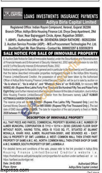 ALL THAT PIECE AND PARCEL COMMERCIAL PROPERTY BEARING A.M.C. NUMBER OF AJMER MUNICIPAL CORPORATION IS 7/11213/11420/393 (GROUND FLOOR SHOP WITHOUT ROOF), HAVING TOTAL AREA IS 113.63 SQ. FT., SITUATED AT SILAWAT MOHALLA, KHARI KHUI, AJMER, RAJASTHAN-305001, AND BOUNDED AS EAST: GALI & PROPERTY OF SMT. LAXMIBAI JL WEST: COMMON WALL THEN OTHER PART PROPERTY OF SAME A.M.C. NO, NORTH: COMMON WALL THEN OTHER SHOP OF SAME A.M.C. NUMBER, SOUTH:PROPERTY OF SMT, LAXMIBAJJI