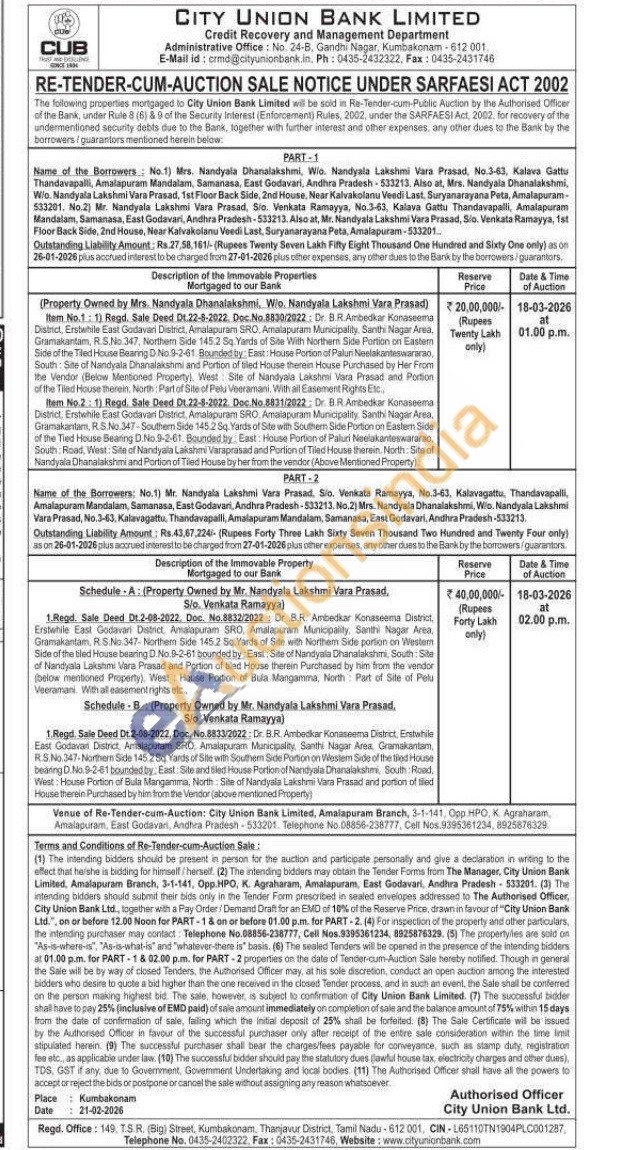 1. Regd. Sale Deed Dt.2-08-2022, Doc. No.8832/2022: Dr. BR Ambedkar Konaseema District, Erstwhile East Godavari District, Amalapuram SRO. Amalapuram Municipality, Santhi Nagar Area, Gramakantam, R.S.No. 347- Northern Side 145.2 Sq Yards of Site with Northem Side portion on Westem Side of the tiled House bearing D.No.9-2-61 bounded by East: Site of Nandyala Dhanalakshmi, South: Site of Nandyala Lakshmi Vara Prasad and Partion of tiled House therein Purchased by him from the vendor (below mentioned Property), West House Portion of Bula Mangamma, North Part of Site of Pelu Veeramani. With all easement rights etc. Schedule B: (Property Owned by Mr. Nandyala Lakshmi Vara Prasad, S/o. Venkata Ramayya) 1. Regd. Sale Deed Dt.2-08-2022, Doc, No.8833/2022: Dr. B.R. Ambedkar Konaseema District, Erstwhile East Godavari District, Amalapuram SRO, Amalapuram Municipality, Santhi Nagar Area Gramakantam, R.S.No. 347- Northern Side 145.2 Sq Yards of Site with Southern Side Portion on Westem Side of the tiled House bearing D.No.9-2-61 bounded by, East: Site and tiled House Portion of Nandyala Dhanalakshmi, South Road, West: House Portion of Bula Mangamma, North Site of Nandyala Lakshmi Vara Prasad and portion of tied House therein Purchased by him from the Vendor (above mentioned Property)