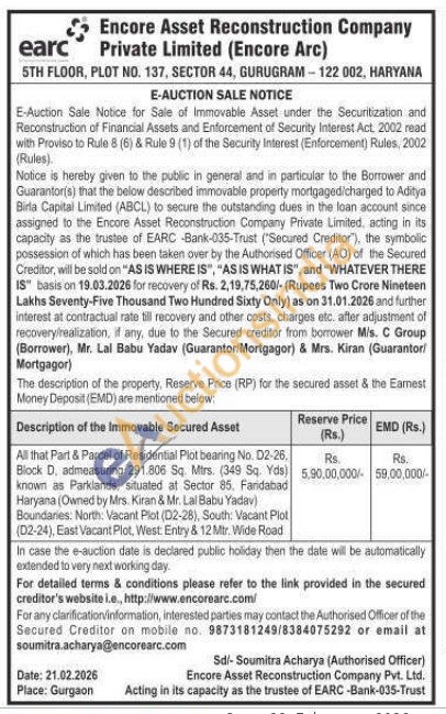 All that Part & Parcel of Residential Plot bearing No. D2-26, Block D. admeasuring 291.806 Sq. Mtrs. (349 Sq. Yds) known as Parklands, situated at Sector 85, Faridabad Haryana (Owned by Mrs. Kiran & Mr. Lal Babu Yadav) Boundaries: North: Vacant Plot (D2-28), South: Vacant Plot (D2-24), East Vacant Plot, West Entry & 12 Mtr. Wide Road