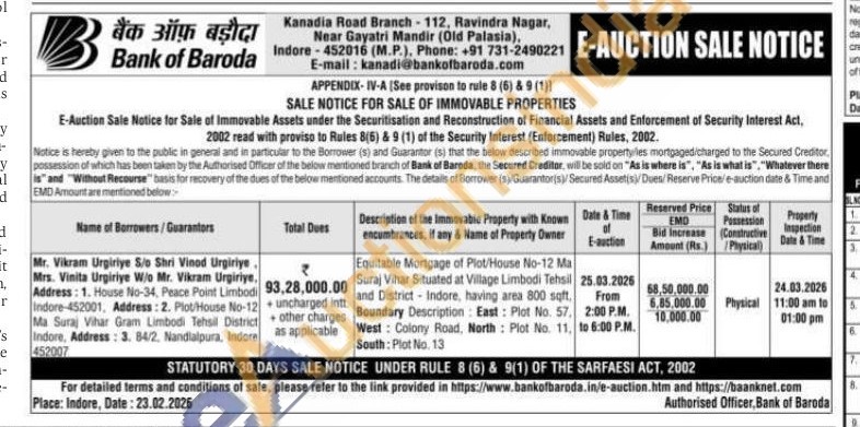 Equitable Mortgage of Plot/House No-12 Ma and District Indore, having area 800 sqft, Boundary Description: East: Plot No. 57, West: Colony Road, North Plot No. 11, South: Plot No. 13 Suraj Vihar Situated at Village Limbodi Tehsil