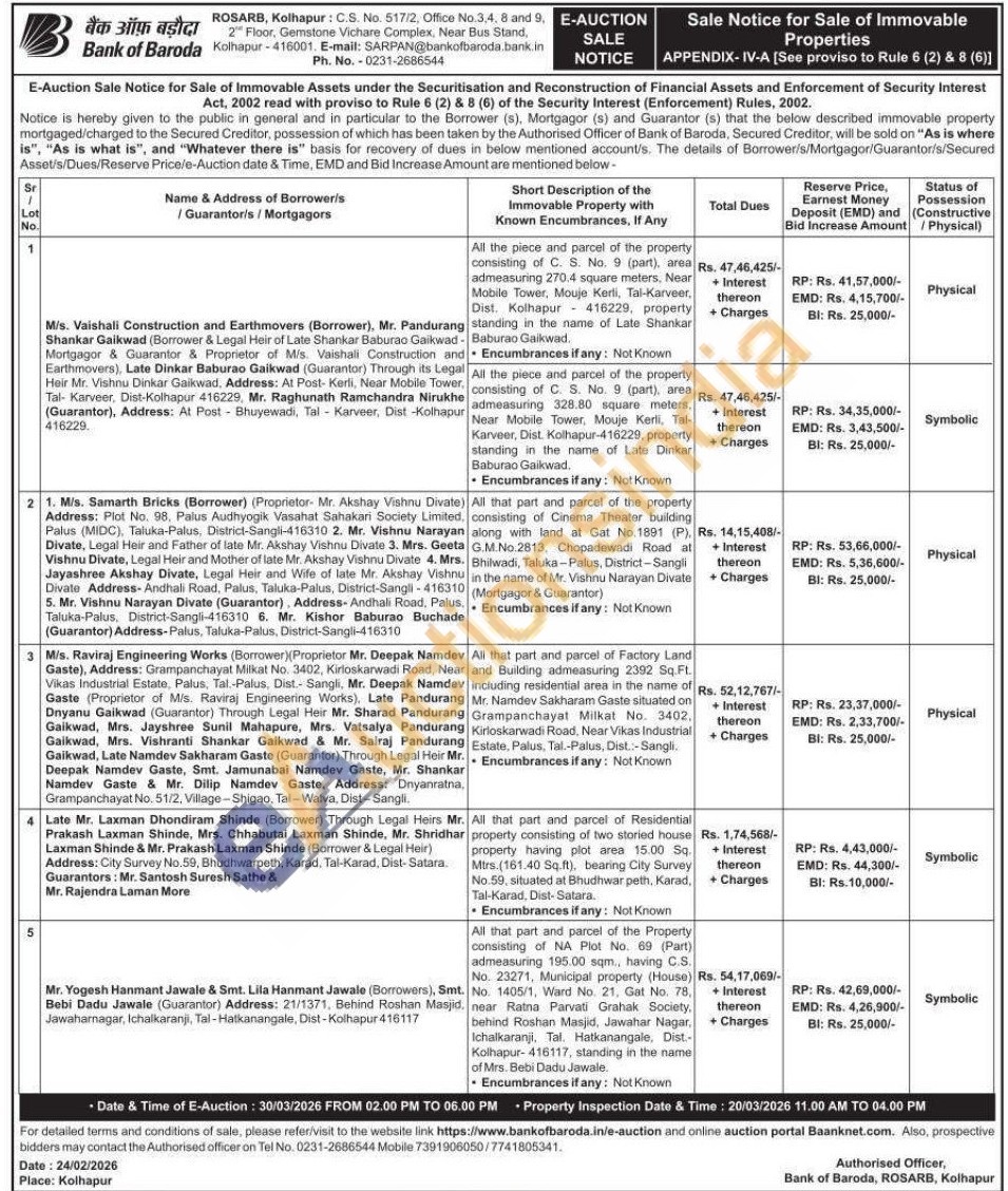 All that part and parcel of Factory Land and Building admeasuring 2392 Sq Ft. including residential area in the name of Mr. Namdev Sakharam Gaste situated on Grampanchayat Milkat No. 3402, Kirloskarwadi Road, Near Vikas Industrial Estate, Palus, Tal.-Palus, Dist-Sangli Encumbrances if any: Not Known