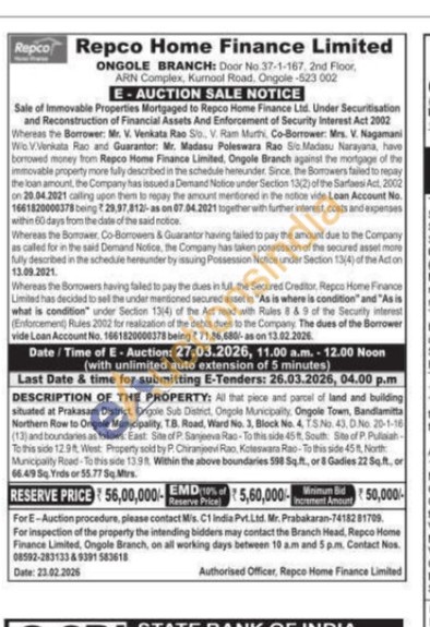 DESCRIPTION OF THE PROPERTY: All that piece and parcel of land and building situated at Prakasam District, Ongole Sub District, Ongole Municipality, Ongole Town, Bandlamitta Northern Row to Ongole Municipality, T.B. Road, Ward No. 2, Block No. 4, 15 No. 43,0.№ 20-1-16 (13) and boundaries as follows. East Site of Sanjeev Rao45th Site of Pulsish To this side 12.9ft. West Property sold by P Chan Rao Koteswas Rao-To this side 45, North Municipally Road-T13.9 Within the above boundaries 598 Sqft, or 8 Gadies 22 Sqft, or 66.495. Yrds or 55.775 Mis