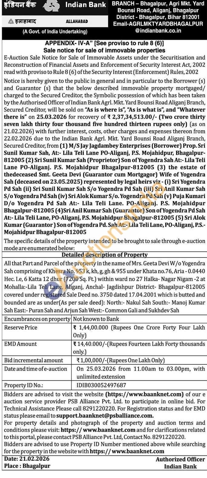 All that Part and Parcel of the property in the name of Mrs. Geeta Devi W/o Yogendra Sah comprising of Khesra No. 953 k, kh, g, gh & 955 under Khata no.76, Aria -0.0440 Hec. 1.e, 6 Katta 12 dhur (7200 Sq. Ft.) within ward no 27 Halka- Nagar Nigam -2 at Mohalla:-Lila Teli Lane, Aliganj, Anchal- Jagdishpur District- Bhagalpur-812005 covered under registered Sale Deed no. 3750 dated 17.04.2001 which is butted and bounded are as under(As per sale deed): North:- Nakul Sah South:- Manoj Kumar Sah East:- Puran Sah and Arjun Sah West:- Common Gali and Sukhdev Sah