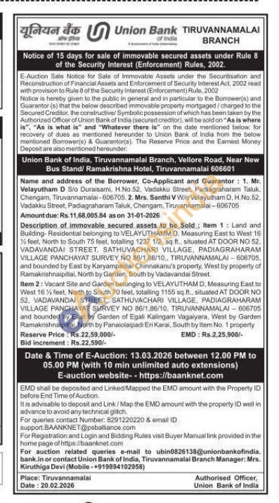 Description of immovable secured assets to be Sold Item 1: Land and Building-Residential belonging to VELAYUTHAMM D. Measuring East to West 16 feet, North to South 75 feet, totalling 1237 1/2 sq ft. situated AT DOOR NO 52. VADAVANDAI STREET, SATHUVACHARI VILLAGE, PADIAGRAHARAM VILLAGE PANCHAYAT SURVEY NO 86/1,88/10, TIRUVANNAMALAI-606705. and bounded by East by Karyampadiar Chinnakanu's property, West by property of Ramakrishnaipillai, North by Garden, South by Vadavandai Street. Item 2: Vacant Site and Garden belonging to VELAYUTHAM D, Measuring East to West 16 feet, North to South 70 feet, totalling 1155 sq.ft., situated AT DOOR NO 52. VADAVANDAI STREET, SATHUVACHARI VILLAGE, PADIAGRAHARAM VILLAGE PANCHAYAT SURVEY NO 86/1,86/10, TIRUVANNAMALAI-606705 and bounded by East by Garden of Egali Kalingam Vagaiyara, West by Garden Ramakrishnaipillai, North by Panaiolapadi Eri Karai, South by Item No. 1 property