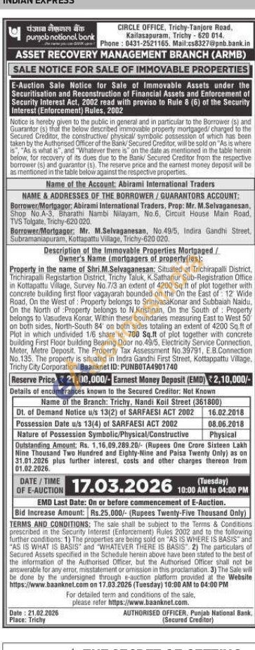 Property in the name of Shri.M.Selvaganesan: Situated at Trichirapalli District, Trichirapalli Registartion District, Trichy Taluk, K.Sathanur Sub-Registration Office in Kottapattu Village, Survey No.7/3 an extent of 4200 Sq.ft of plot together with concrete building first floor vagayarah bounded on the On the East of 12 Wide Road, On the West of: Property belongs to Srinivasakonar and Subbaiah Naidu, On the North of Property belongs to N.Krishnan, On the South of Property belongs to Vasudeva Kornar, Within these boundaries measuring East to West 50 on both sides, North-South 84 on both sides totaling an extent of 4200 Sq.ft of Plat in which undivided 1/6 share ie. 700 Sq.ft of plot together with concrete building First Floor building Bearing Door no.49/5, Electricity Service Connection, Meter, Metre Deposit. The Property Tax Assessment No.39791, E.B.Connection No. 135. The property is situated in Indra Gandhi First Street, Kottappattu Village, Trichy City Corporation, Baanknet ID: PUNBOTA4901740