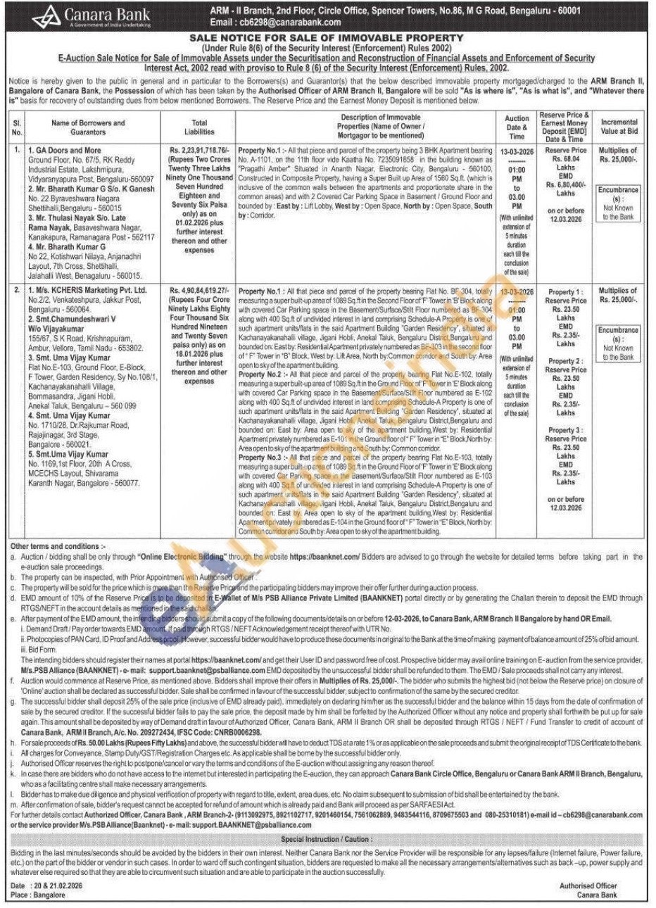 Property No.2: All that piece and parcel of the property bearing Flat No.E-102, totally measuring a super built-up area of 1089 Sq.ft in the Ground Floor of 'F' Tower in E' Block along with covered Car Parking space in the Basement/Surface/Stilt Floor numbered as E-102 along with 400 Sq.ft of undivided interest in land comprising Schedule-A Property is one of such apartment units/flats in the said Apartment Building "Garden Residency', situated at Kachanayakanahalli vilage, Jigani Hobli, Anekal Taluk, Bengaluru District, Bengaluru and bounded on: East by: Area open to sky of the apartment building, West by: Residential Apartment privately numbered as E-101 in the Ground floor of F" Tower in "E" Block, North by: Area open to sky of the apartment building and South by: Common corridor