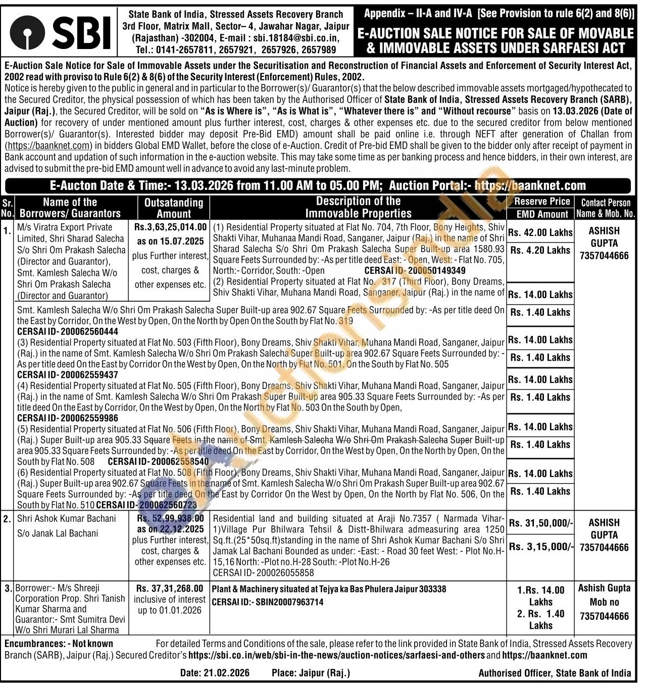 (2) Residential Property situated at Flat No. 317 (Third Floor), Bony Dreams. Shiv Shakti Vihar, Muhana Mandi Road, Sanganer, Jaipur (Raj.) in the name of Smt. Kamlesh Salecha W/o Shri Om Prakash Salecha Super Built-up area 902.67 Square Feets Surrounded by: -As per title deed On the East by Corridor, On the West by Open, On the North by Open On the South by Flat No. 319