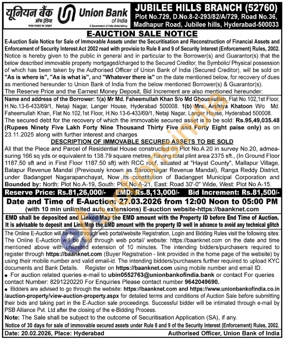 DESCRIPTION OF IMMOVABLE SECURED ASSETS TO BE SOLD : All that the Piece and Parcel of Residential House constructed on Plot No.A 20 in survey No.20, admea-suring 166 sq yds or equivalent to 138.79 square metres, having total plint area 2375 sft., (In Ground Floor 1187.50 sft and in First Floor 1187.50 sft) with RCC roof, situated at "Hayat County", Mallapur Village, Balapur Revenue Mandal (Previously known as Saroornagar Revenue Mandal), Ranga Reddy District, under Badangpet Nagarapanchayat, Now its constitution of Badangpet Municipal Corporation and Bounded by: North: Plot No.A-19, South: Plot No.A-21, East: Road 30'-0" Wide, West: Plot No A-15