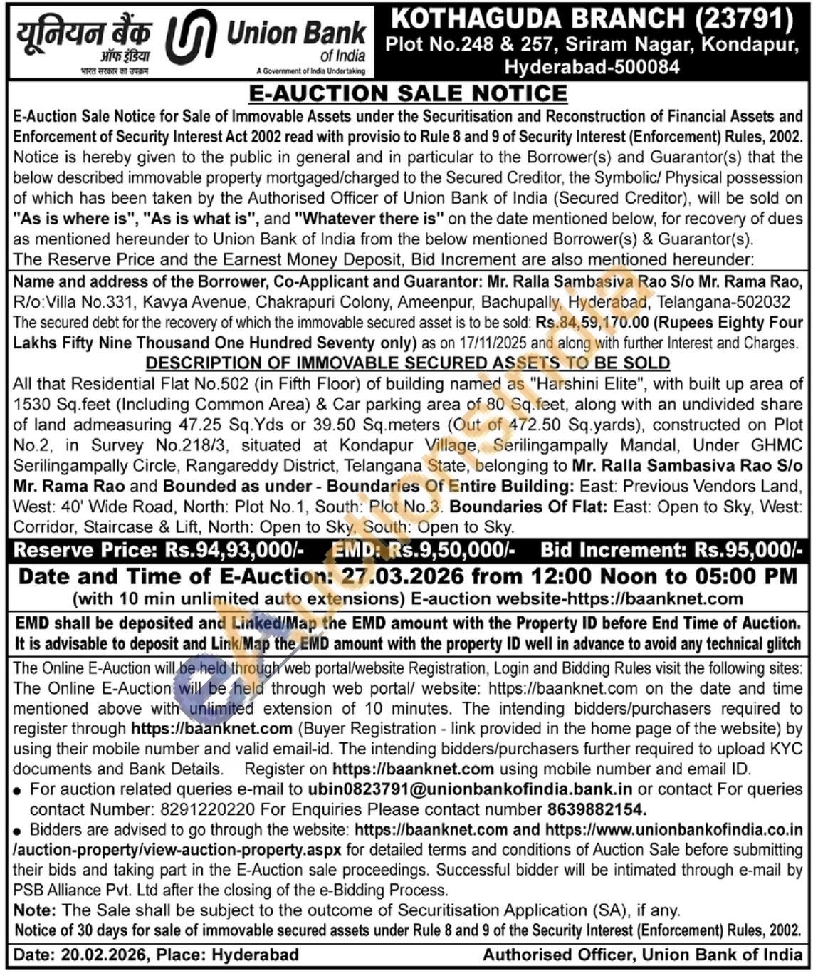 DESCRIPTION OF IMMOVABLE SECURED ASSETS TO BE SOLD : All that Residential Flat No.502 (in Fifth Floor) of building named as "Harshini Elite", with built up area of 1530 Sq.feet (Including Common Area) & Car parking area of 80 Sq.feet, along with an undivided share of land admeasuring 47.25 Sq. Yds or 39.50 Sq.meters (Out of 472.50 Sq.yards), constructed on Plot No.2, in Survey No.218/3, situated at Kondapur Village, Serilingampally Mandal, Under GHMC Serilingampally Circle, Rangareddy District, Telangana State, belonging to Mr. Ralla Sambasiva Rao S/o Mr. Rama Rao and Bounded as under - Boundaries Of Entire Building: East: Previous Vendors Land, West: 40' Wide Road, North: Plot No. 1, South: Plot No.3. Boundaries Of Flat: East: Open to Sky, West: Corridor, Staircase & Lift, North: Open to Sky, South: Open to Sky