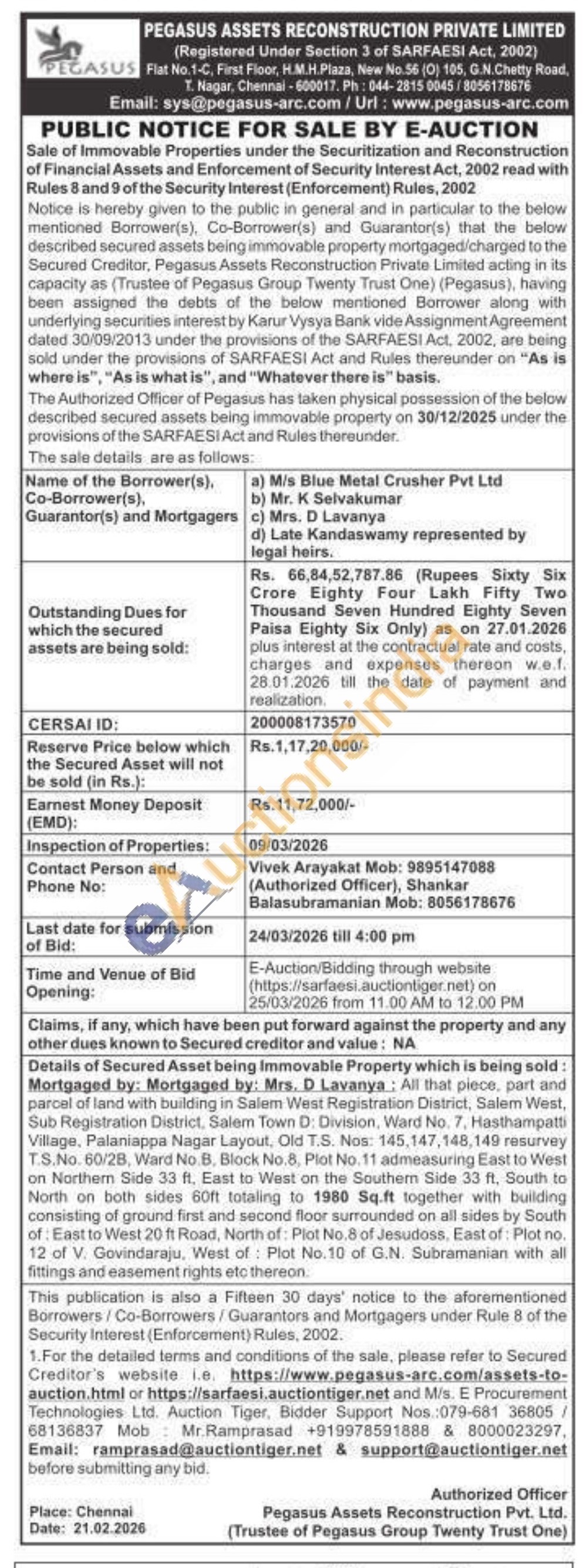 All that piece, part and parcel of land with building in Salem West Registration District, Salem West, Sub Registration District, Salem Town D: Division, Ward No. 7. Hasthampatti Viliage, Palaniappa Nagar Layout, Old T.S. Nos: 145,147, 148,140 resurvey TS.No. 60/28, Ward No.B, Block No. 8, Plot No. 11 admeasuring East to West on Northern Side 33 ft. East to West on the Southem Side 33 ft, South to North on both sides 60ft totaling to 1980 Sq.ft together with building consisting of ground first and second floor surrounded on all sides by South of: East to West 20 ft Road, North of Plot No.8 of Jesudoss, East of Plot no. 12 of V. Govindaraju, West of Plot No.10 of G.N. Subramanian with all fittings and easement nghts etc thereon.